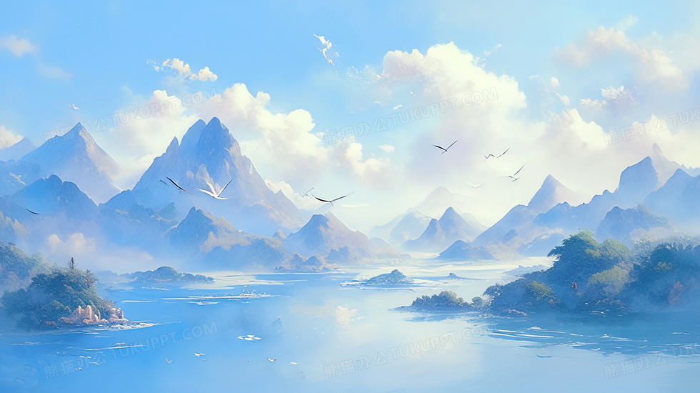 本作品内容为蓝色唯美意境山水大自然风景插画, 格式为 jpg, 大小3 MB, 图片尺寸为2912 x 1632, 源文件无水印, 欢迎使用熊猫办公。 如认为平台内容涉嫌侵权,可通过邮件:tousu@tukuppt.com提出书面通知,我们将及时处理。