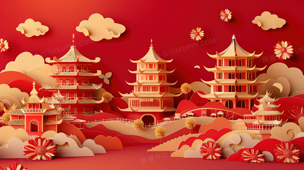 本作品内容为红色3D立体古建筑山水插画, 格式为 jpg, 大小3 MB, 图片尺寸为2912 x 1632, 源文件无水印, 欢迎使用熊猫办公。 如认为平台内容涉嫌侵权,可通过邮件:tousu@tukuppt.com提出书面通知,我们将及时处理。