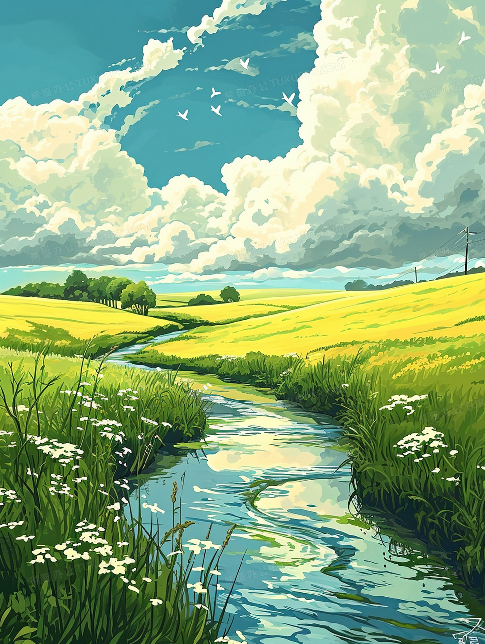 本作品内容为春天花田中的小河唯美风景插画, 格式为 jpg, 大小3 MB, 图片尺寸为1856 x 2464, 源文件无水印, 欢迎使用熊猫办公。 如认为平台内容涉嫌侵权,可通过邮件:tousu@tukuppt.com提出书面通知,我们将及时处理。