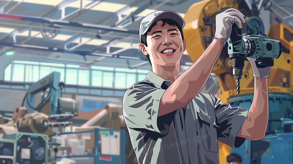 本作品内容为劳动节工作的男性车间工人插画, 格式为 jpg, 大小2 MB, 图片尺寸为2912 x 1632, 源文件无水印, 欢迎使用熊猫办公。 如认为平台内容涉嫌侵权,可通过邮件:tousu@tukuppt.com提出书面通知,我们将及时处理。