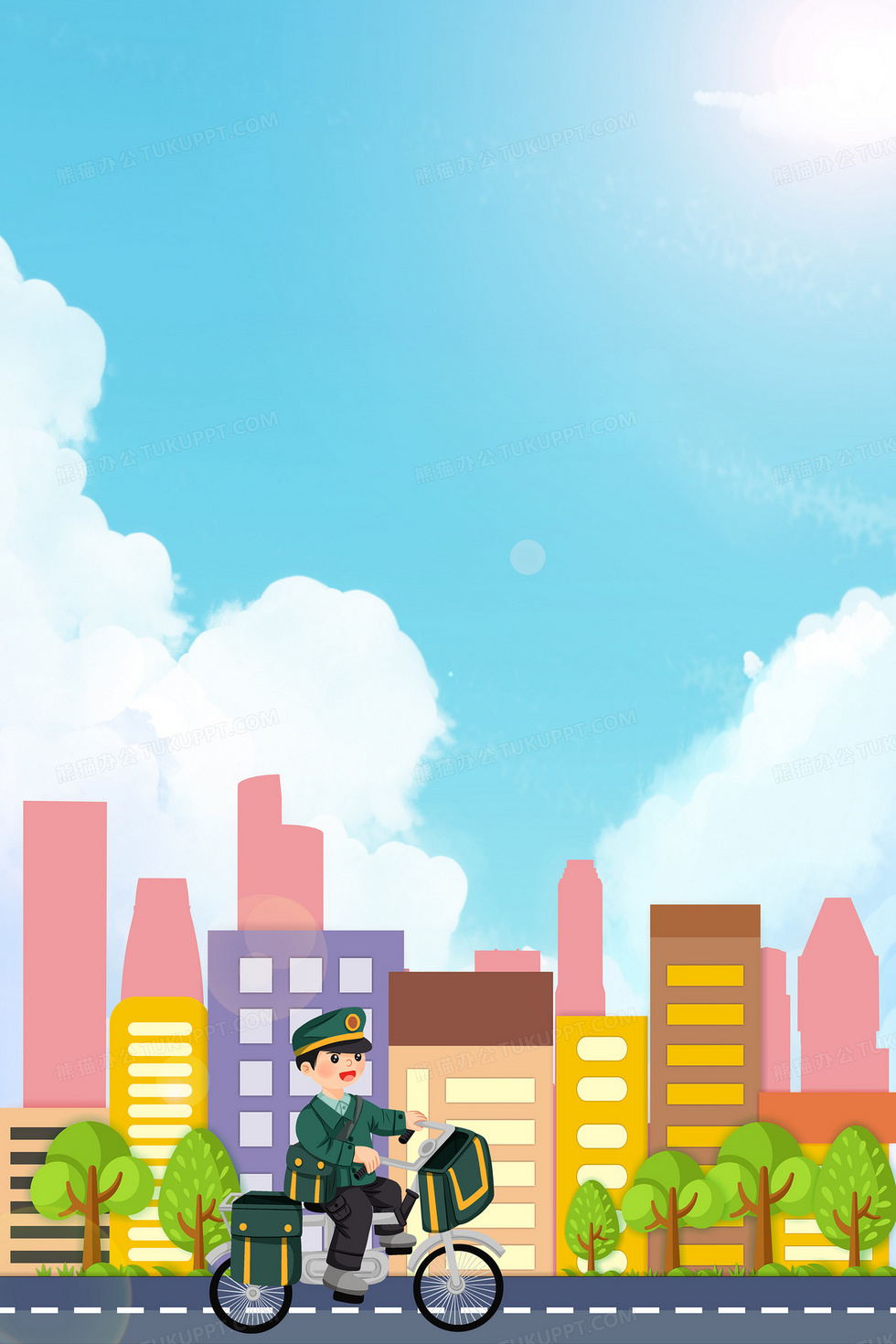 本作品内容为卡通插画风邮递员送信背景, 格式为 psd, 大小18 MB, 图片尺寸为3543 x 5315, 作品中背景图片无需修改, 源文件无水印,可以直接使用, 欢迎使用熊猫办公。 如认为平台内容涉嫌侵权,可通过邮件:tousu@tukuppt.com提出书面通知,我们将及时处理。