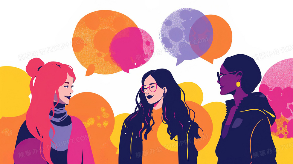 本作品内容为彩色交谈谈论的女孩插画, 格式为 jpg, 大小2 MB, 图片尺寸为2912 x 1632, 源文件无水印, 欢迎使用熊猫办公。 如认为平台内容涉嫌侵权,可通过邮件:tousu@tukuppt.com提出书面通知,我们将及时处理。