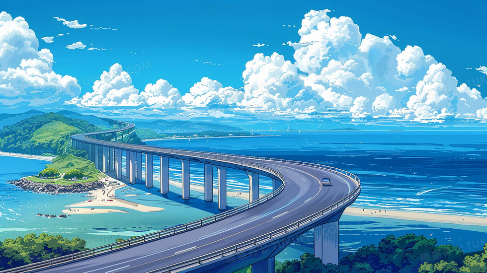 本作品内容为夏季跨海公路大桥插画, 格式为 jpg, 大小4 MB, 图片尺寸为2912 x 1632, 源文件无水印, 欢迎使用熊猫办公。 如认为平台内容涉嫌侵权,可通过邮件:tousu@tukuppt.com提出书面通知,我们将及时处理。