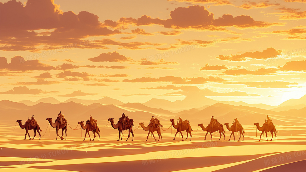 本作品内容为橙色沙漠上的驼队背景, 格式为 jpg, 大小3 MB, 图片尺寸为2912 x 1632, 作品中背景图片无需修改, 源文件无水印,可以直接使用, 欢迎使用熊猫办公。 如认为平台内容涉嫌侵权,可通过邮件:tousu@tukuppt.com提出书面通知,我们将及时处理。