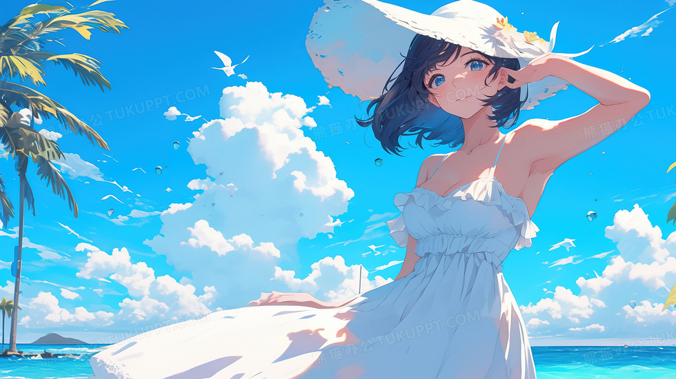 本作品内容为夏季海边度假的女孩插画, 格式为 jpg, 大小3 MB, 图片尺寸为2912 x 1632, 源文件无水印, 欢迎使用熊猫办公。 如认为平台内容涉嫌侵权,可通过邮件:tousu@tukuppt.com提出书面通知,我们将及时处理。