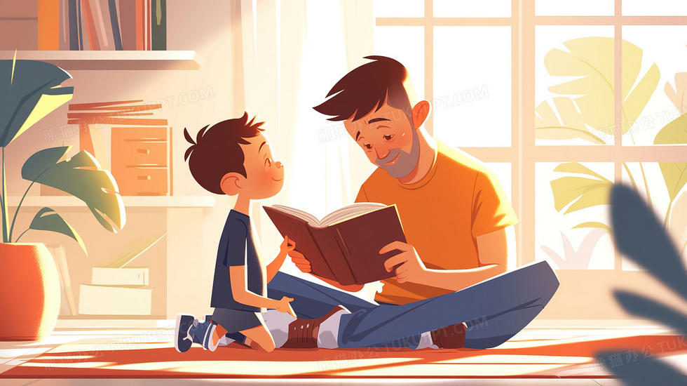 本作品内容为爸爸陪伴小男孩看书插画, 格式为 jpg, 大小2 MB, 图片尺寸为2912 x 1632, 源文件无水印, 欢迎使用熊猫办公。 如认为平台内容涉嫌侵权,可通过邮件:tousu@tukuppt.com提出书面通知,我们将及时处理。