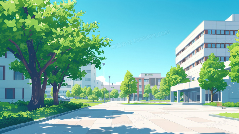 本作品内容为学校教学楼室外景观插画, 格式为 jpg, 大小3 MB, 图片尺寸为2912 x 1632, 源文件无水印, 欢迎使用熊猫办公。 如认为平台内容涉嫌侵权,可通过邮件:tousu@tukuppt.com提出书面通知,我们将及时处理。