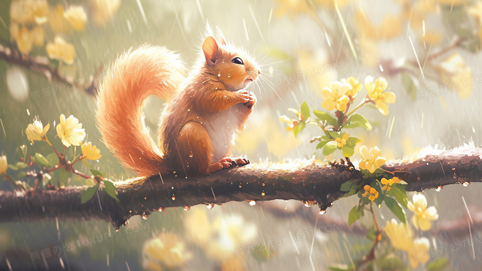 本作品内容为雨中在树枝上面的可爱的小松鼠淡黄色背景插画, 格式为 jpg, 大小3 MB, 图片尺寸为2912 x 1632, 源文件无水印, 欢迎使用熊猫办公。 如认为平台内容涉嫌侵权,可通过邮件:tousu@tukuppt.com提出书面通知,我们将及时处理。