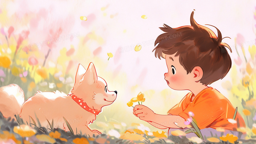 本作品内容为鲜花丛里的小男孩与小狗插画, 格式为 jpg, 大小2 MB, 图片尺寸为2912 x 1632, 源文件无水印, 欢迎使用熊猫办公。 如认为平台内容涉嫌侵权,可通过邮件:tousu@tukuppt.com提出书面通知,我们将及时处理。