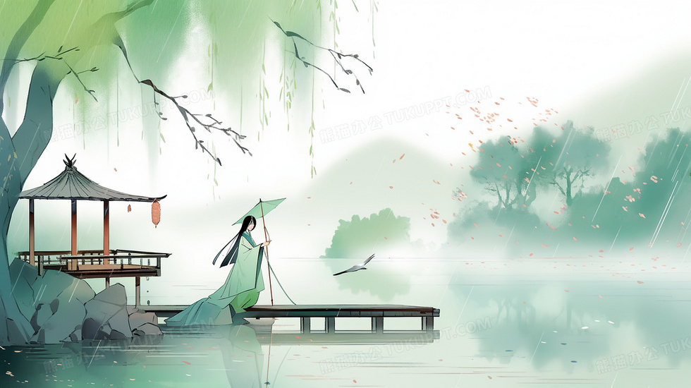 本作品内容为雨水天气一绿衣女子撑着伞在河边船渡口等人水墨画插画, 格式为 jpg, 大小2 MB, 图片尺寸为2912 x 1632, 源文件无水印, 欢迎使用熊猫办公。 如认为平台内容涉嫌侵权,可通过邮件:tousu@tukuppt.com提出书面通知,我们将及时处理。