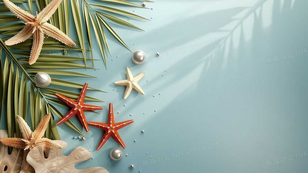 本作品内容为夏季蓝色海星棕榈叶装饰背景, 格式为 jpg, 大小3 MB, 图片尺寸为2912 x 1632, 作品中背景图片无需修改, 源文件无水印,可以直接使用, 欢迎使用熊猫办公。 如认为平台内容涉嫌侵权,可通过邮件:tousu@tukuppt.com提出书面通知,我们将及时处理。