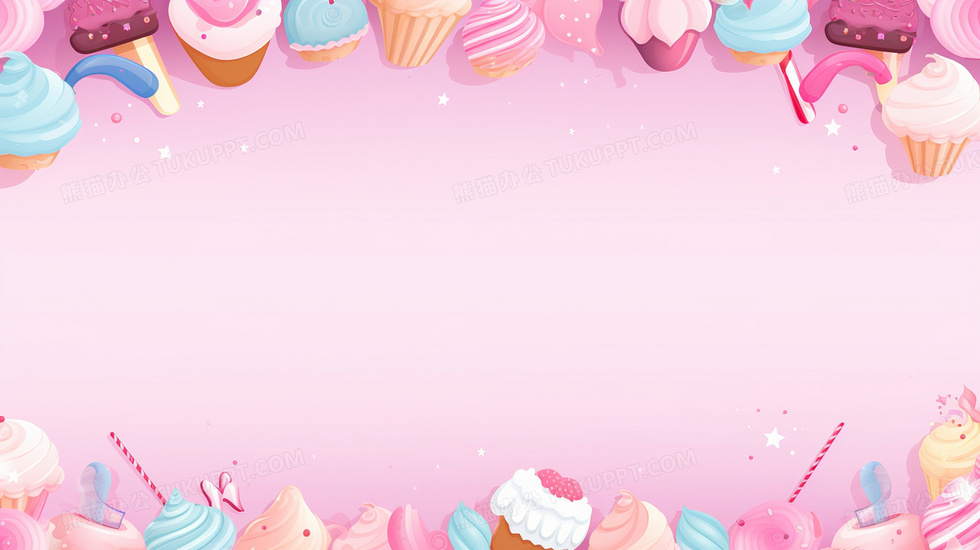 本作品内容为卡通甜点简约边框可爱风背景, 格式为 jpg, 大小2 MB, 图片尺寸为2912 x 1632, 作品中背景图片无需修改, 源文件无水印,可以直接使用, 欢迎使用熊猫办公。 如认为平台内容涉嫌侵权,可通过邮件:tousu@tukuppt.com提出书面通知,我们将及时处理。