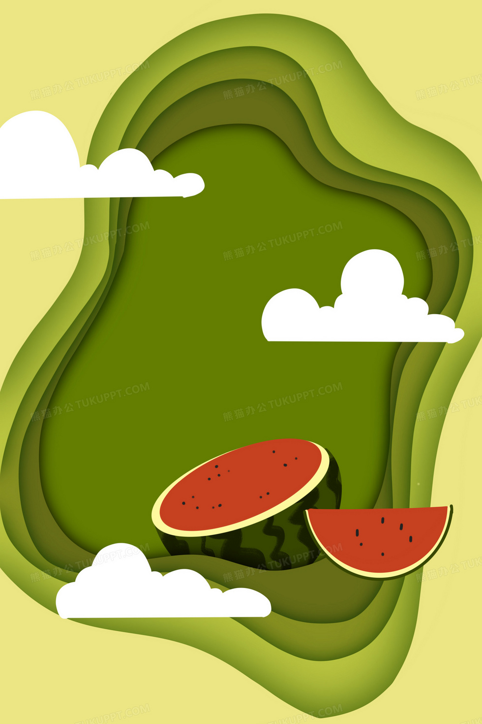 本作品内容为绿色夏日西瓜剪纸手绘插画背景, 格式为 psd, 大小16 MB, 图片尺寸为3543 x 5315, 作品中背景图片无需修改, 源文件无水印,可以直接使用, 欢迎使用熊猫办公。 如认为平台内容涉嫌侵权,可通过邮件:tousu@tukuppt.com提出书面通知,我们将及时处理。