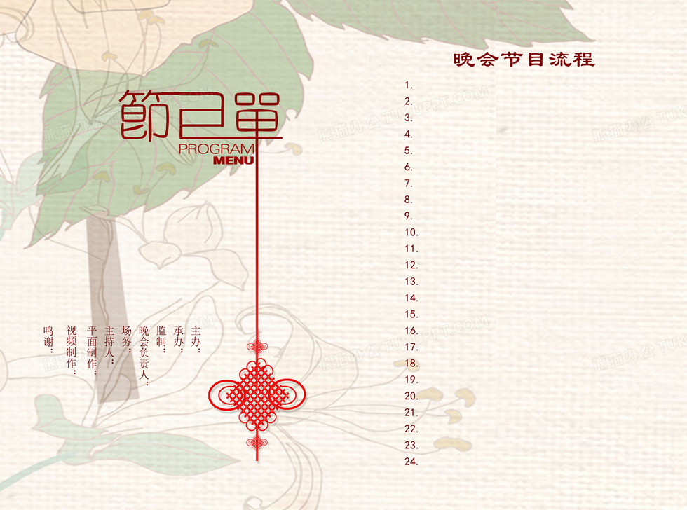本作品内容为背景 中国结 底纹花色树叶晚会节目单, 格式为 psd, 图片尺寸为3437 x 2551, 作品中背景图片无需修改, 源文件无水印,可以直接使用, 欢迎使用熊猫办公。 如认为平台内容涉嫌侵权,可通过邮件:tousu@tukuppt.com提出书面通知,我们将及时处理。