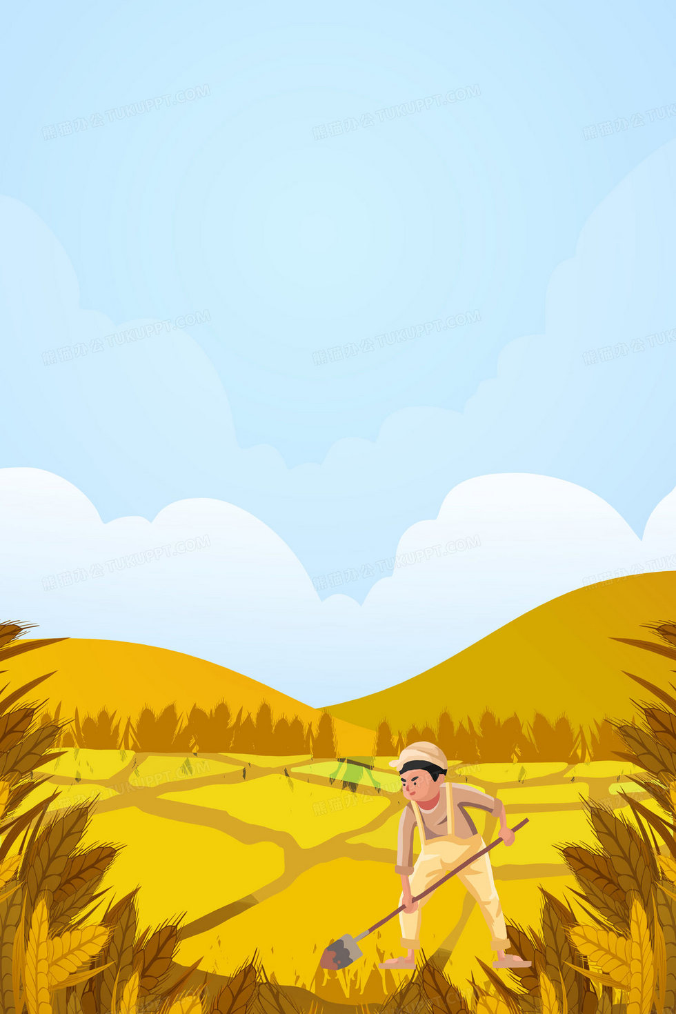 本作品内容为农民丰收农村振兴手绘卡通背景, 格式为 psd, 大小8 MB, 图片尺寸为2362 x 3543, 作品中背景图片无需修改, 源文件无水印,可以直接使用, 欢迎使用熊猫办公。 如认为平台内容涉嫌侵权,可通过邮件:tousu@tukuppt.com提出书面通知,我们将及时处理。
