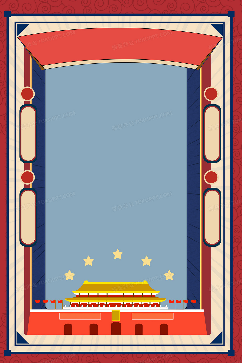 本作品内容为国庆节复古边框天安门十一党政党建背景, 格式为 psd, 大小36 MB, 图片尺寸为3543 x 5315, 作品中背景图片无需修改, 源文件无水印,可以直接使用, 欢迎使用熊猫办公。 如认为平台内容涉嫌侵权,可通过邮件:tousu@tukuppt.com提出书面通知,我们将及时处理。