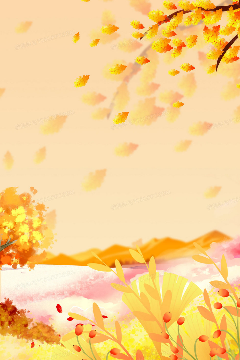 本作品内容为卡通手绘橙色秋天落叶背景, 格式为 psd, 大小25 MB, 图片尺寸为2362 x 3543, 作品中背景图片无需修改, 源文件无水印,可以直接使用, 欢迎使用熊猫办公。 如认为平台内容涉嫌侵权,可通过邮件:tousu@tukuppt.com提出书面通知,我们将及时处理。