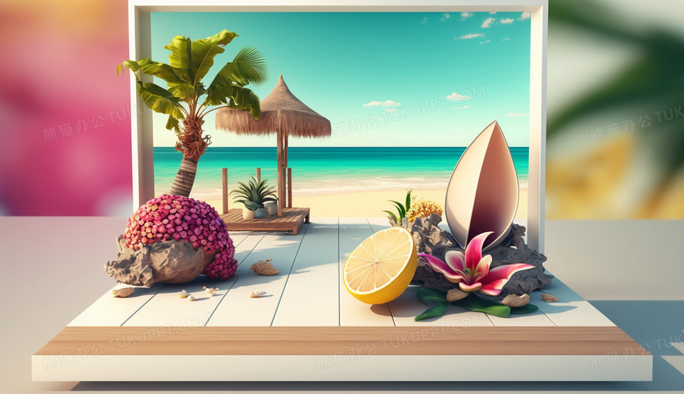 本作品内容为热情海边轻松假期夏天氛围台面展示模型插画, 格式为 jpg, 大小2 MB, 图片尺寸为1664 x 960, 源文件无水印, 欢迎使用熊猫办公。 如认为平台内容涉嫌侵权,可通过邮件:tousu@tukuppt.com提出书面通知,我们将及时处理。
