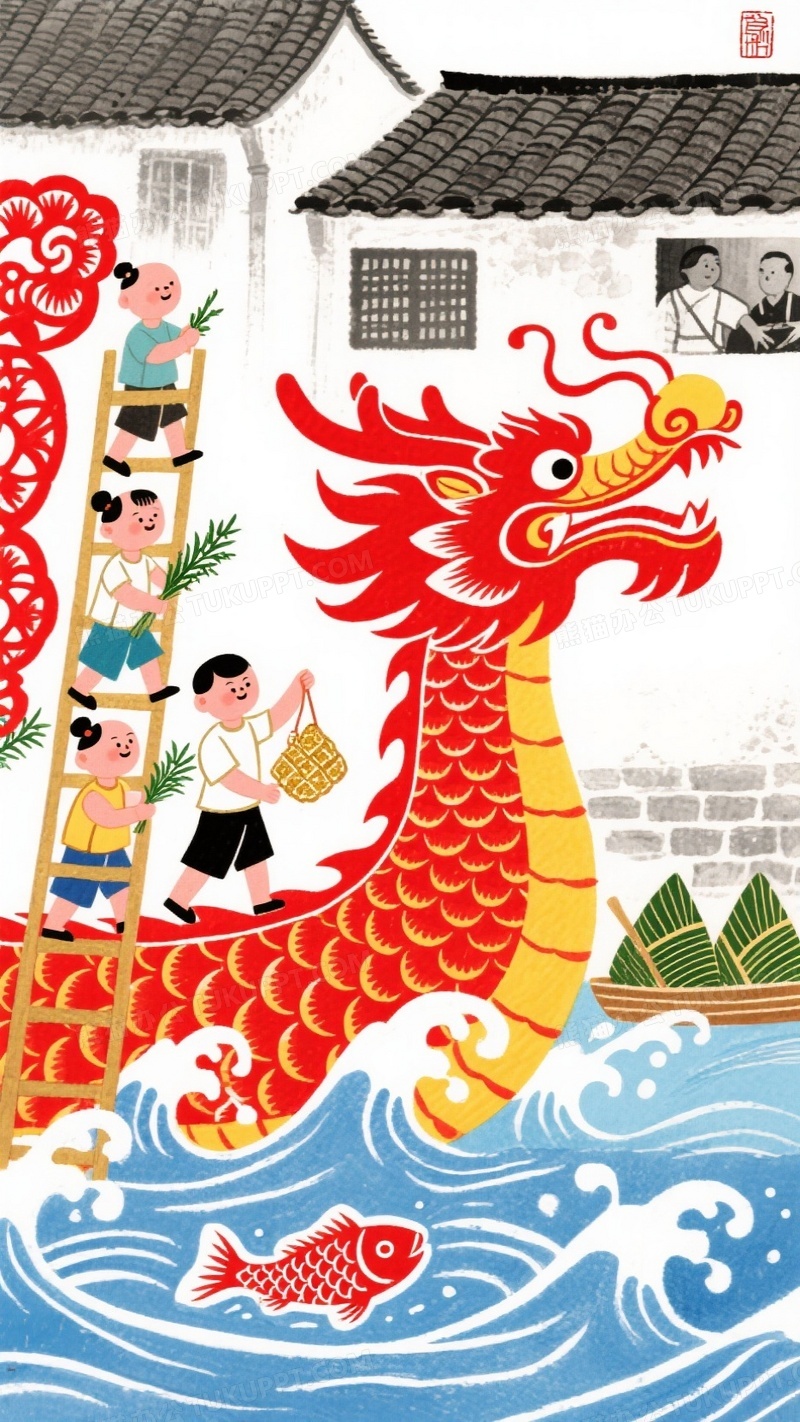 本作品内容为中国农民画与剪纸风格的端午节插画, 格式为 jpg, 大小1 MB, 图片尺寸为936 x 1664, 源文件无水印, 欢迎使用熊猫办公。 如认为平台内容涉嫌侵权,可通过邮件:tousu@tukuppt.com提出书面通知,我们将及时处理。