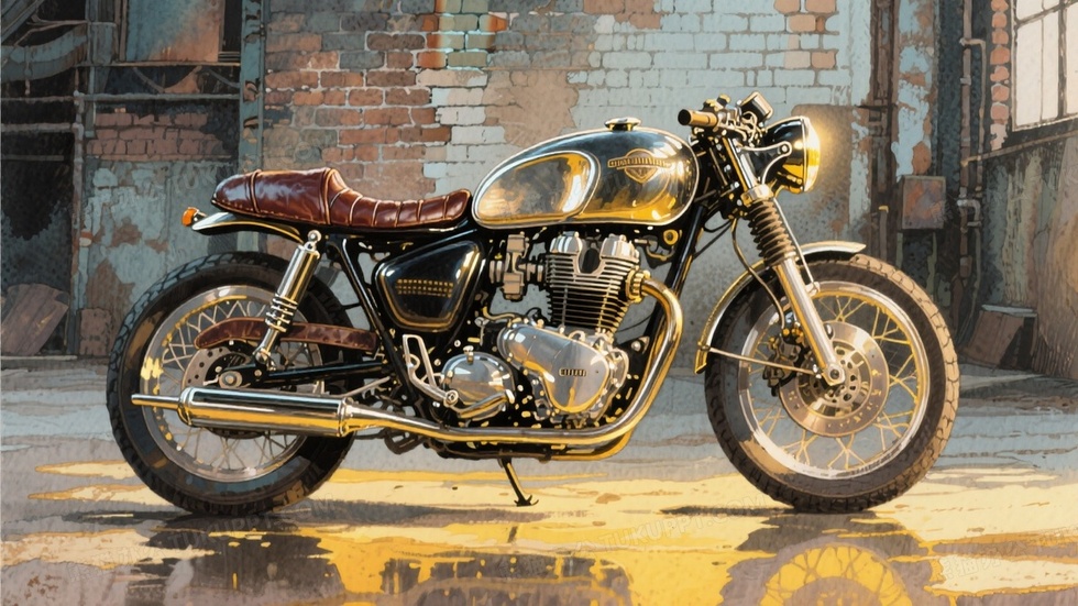 首页 > 插画 > 科技艺术 > 水彩手绘 > 复古风格摩托车插画流线型车身搭配皮革座椅和金属饰件