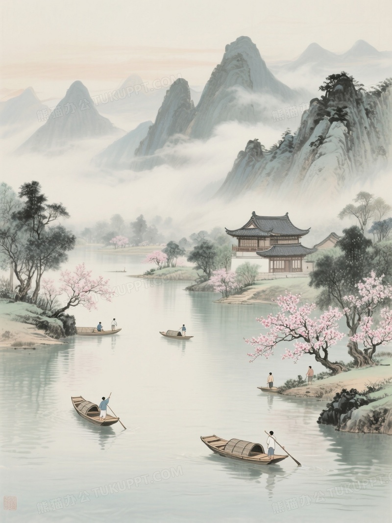 本作品内容为一幅典型古风的中国山水画风格, 格式为 jpg, 大小1 MB, 图片尺寸为1104 x 1472, 源文件无水印, 欢迎使用熊猫办公。 如认为平台内容涉嫌侵权,可通过邮件:tousu@tukuppt.com提出书面通知,我们将及时处理。