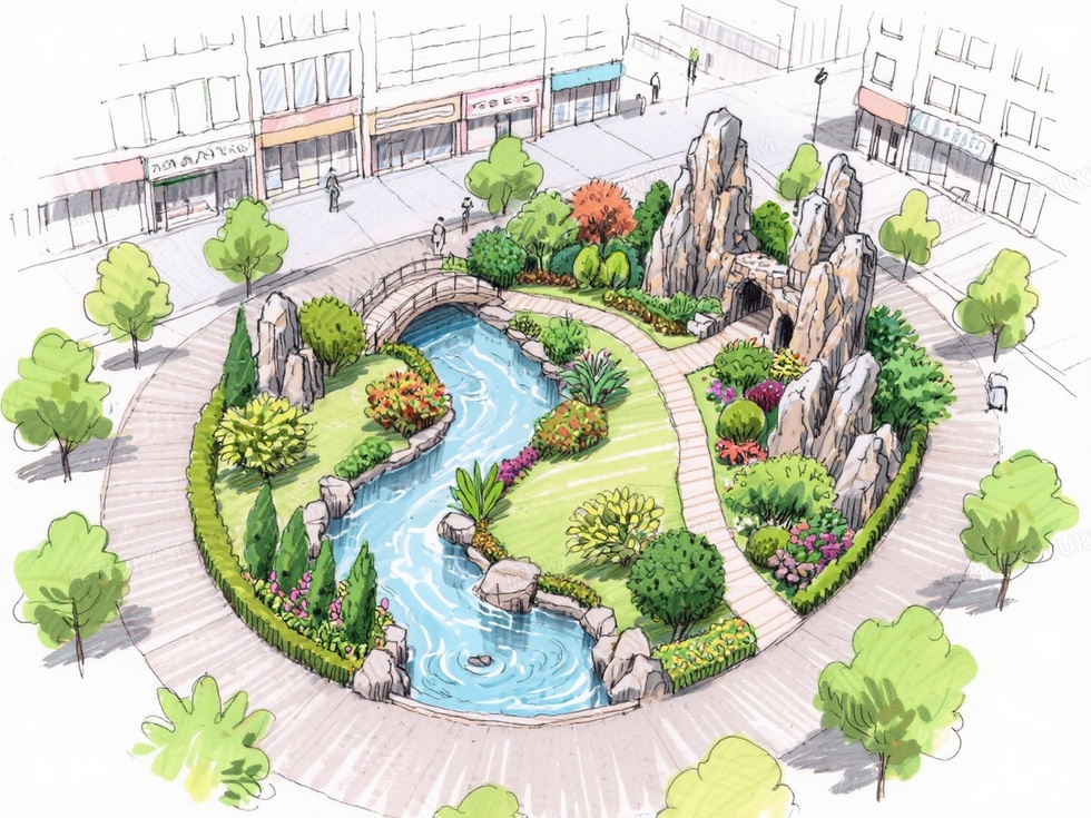 首页 > 插画 > 科技艺术 > 水彩手绘 > 手绘图街心花园的绿化景观效果图