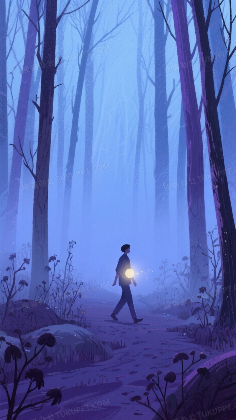 梦幻风卡通平面插画一个人在充满雾气的森林中缓慢行走