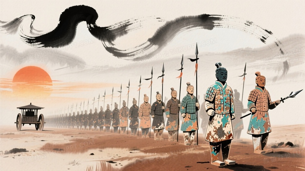 本作品内容为水墨风格俑阵行进图流动墨色表现陶俑彩绘剥落感, 格式为 jpg, 大小1 MB, 图片尺寸为1664 x 936, 源文件无水印, 欢迎使用熊猫办公。 如认为平台内容涉嫌侵权,可通过邮件:tousu@tukuppt.com提出书面通知,我们将及时处理。