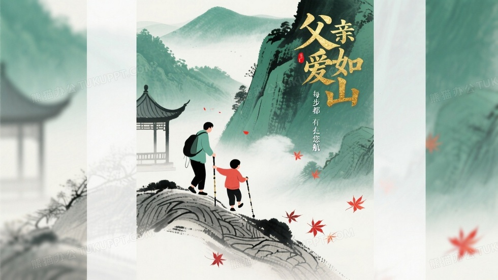 本作品内容为国风水墨父子登山画面, 格式为 jpg, 大小1 MB, 图片尺寸为1664 x 936, 源文件无水印, 欢迎使用熊猫办公。 如认为平台内容涉嫌侵权,可通过邮件:tousu@tukuppt.com提出书面通知,我们将及时处理。