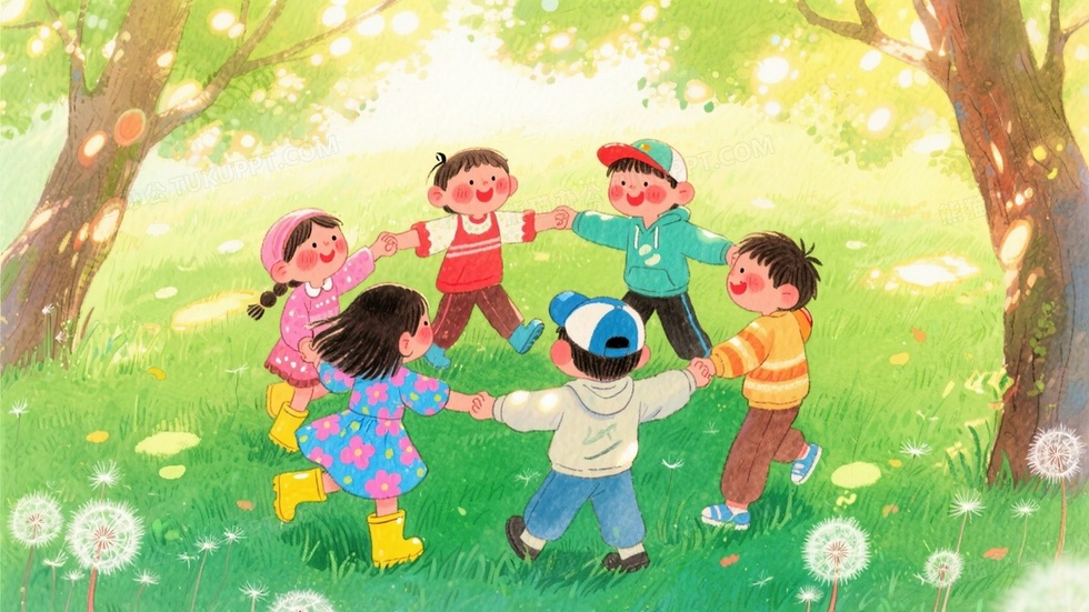 本作品内容为卡通风格插画五个小朋友手拉手围成圆圈跳舞, 格式为 jpg, 大小1 MB, 图片尺寸为1664 x 936, 源文件无水印, 欢迎使用熊猫办公。 如认为平台内容涉嫌侵权,可通过邮件:tousu@tukuppt.com提出书面通知,我们将及时处理。