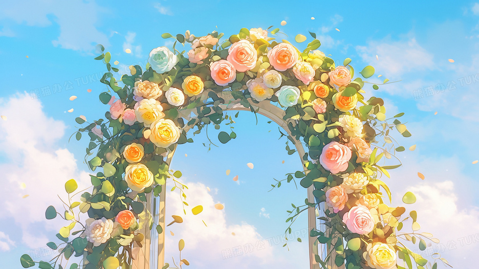 本作品内容为蓝天白云唯美弧形花卉装饰插画, 格式为 jpg, 大小3 MB, 图片尺寸为2912 x 1632, 源文件无水印, 欢迎使用熊猫办公。 如认为平台内容涉嫌侵权,可通过邮件:tousu@tukuppt.com提出书面通知,我们将及时处理。