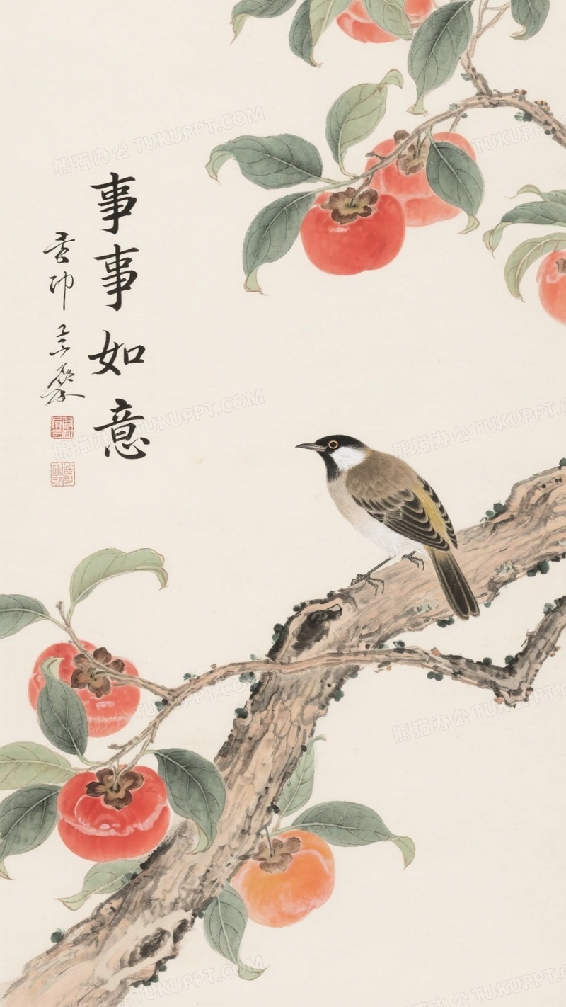 本作品内容为工笔画树枝上挂着红柿子和绿叶, 格式为 jpg, 大小1 MB, 图片尺寸为936 x 1664, 源文件无水印, 欢迎使用熊猫办公。 如认为平台内容涉嫌侵权,可通过邮件:tousu@tukuppt.com提出书面通知,我们将及时处理。