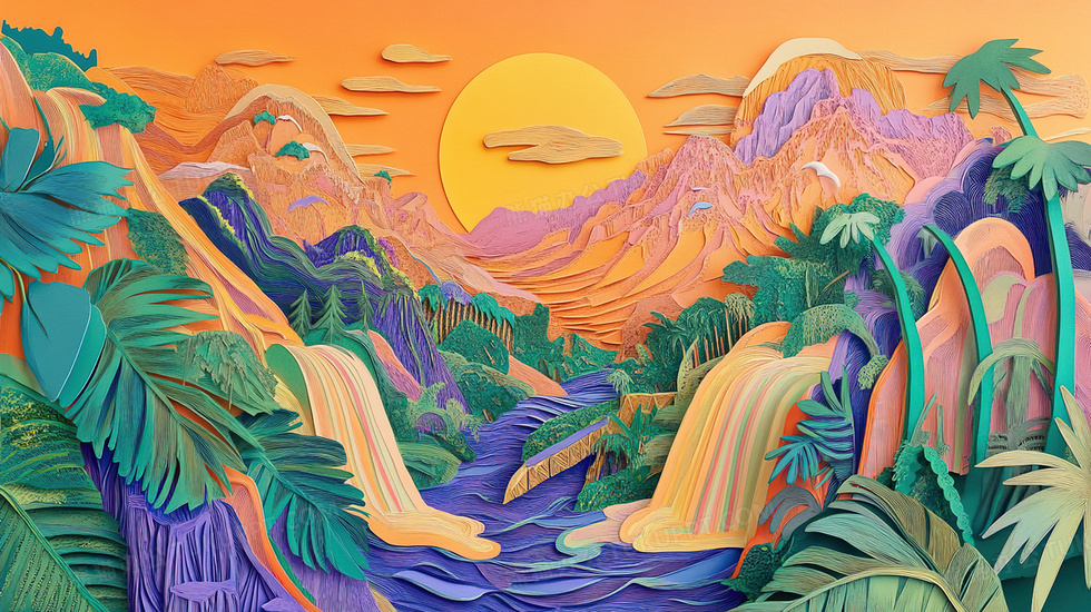 本作品内容为剪纸风户外山谷山脉日出日落插画, 格式为 jpg, 大小9 MB, 图片尺寸为2912 x 1632, 源文件无水印, 欢迎使用熊猫办公。 如认为平台内容涉嫌侵权,可通过邮件:tousu@tukuppt.com提出书面通知,我们将及时处理。