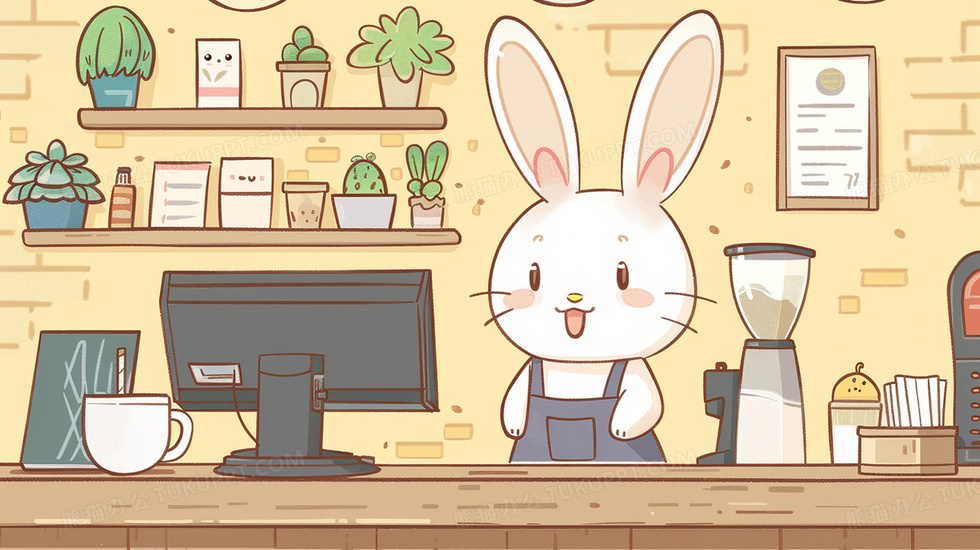 本作品内容为在咖啡店工作的小兔子卡通插画, 格式为 jpg, 大小3 MB, 图片尺寸为2912 x 1632, 源文件无水印, 欢迎使用熊猫办公。 如认为平台内容涉嫌侵权,可通过邮件:tousu@tukuppt.com提出书面通知,我们将及时处理。
