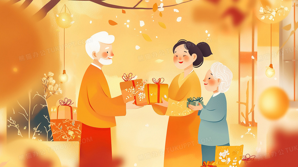 本作品内容为中国春节新年走亲友送礼一家人插画, 格式为 jpg, 大小3 MB, 图片尺寸为2912 x 1632, 源文件无水印, 欢迎使用熊猫办公。 如认为平台内容涉嫌侵权,可通过邮件:tousu@tukuppt.com提出书面通知,我们将及时处理。