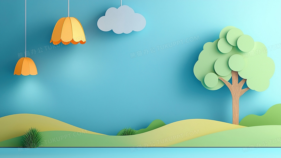 本作品内容为清新山水树木吊灯剪纸背景, 格式为 jpg, 大小2 MB, 图片尺寸为2912 x 1632, 作品中背景图片无需修改, 源文件无水印,可以直接使用, 欢迎使用熊猫办公。 如认为平台内容涉嫌侵权,可通过邮件:tousu@tukuppt.com提出书面通知,我们将及时处理。