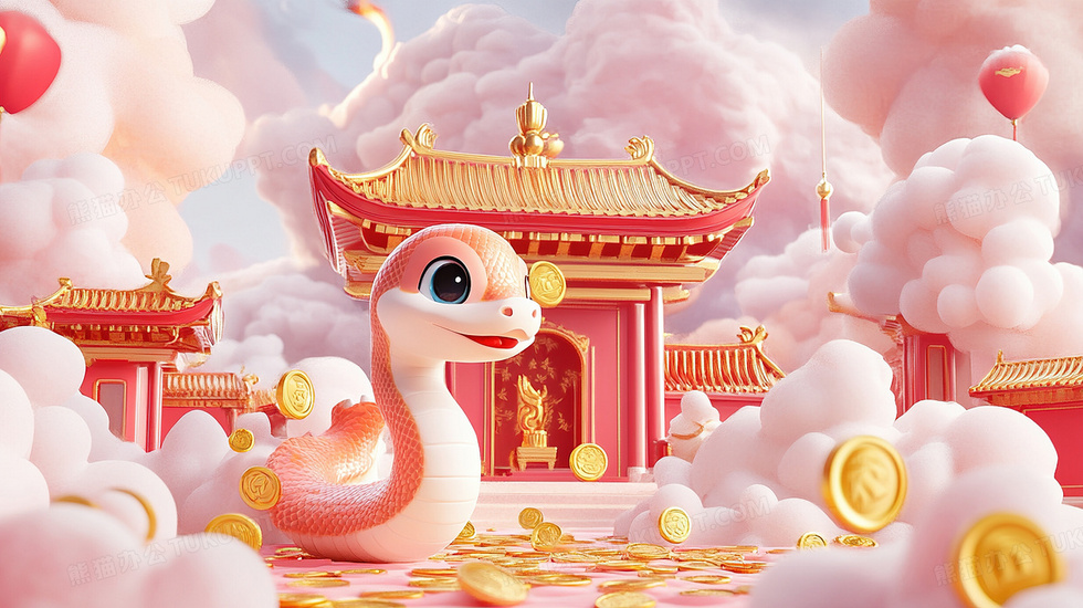 本作品内容为3D蛇年与爬行可爱蛇金币创意国潮建筑插画, 格式为 jpg, 大小3 MB, 图片尺寸为2912 x 1632, 源文件无水印, 欢迎使用熊猫办公。 如认为平台内容涉嫌侵权,可通过邮件:tousu@tukuppt.com提出书面通知,我们将及时处理。