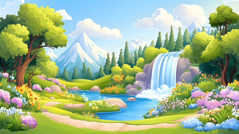 本作品内容为卡通风格春天河流风景瀑布湖水插画, 格式为 jpg, 大小3 MB, 图片尺寸为2912 x 1632, 源文件无水印, 欢迎使用熊猫办公。 如认为平台内容涉嫌侵权,可通过邮件:tousu@tukuppt.com提出书面通知,我们将及时处理。