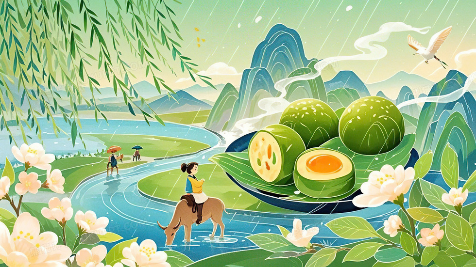 首页 > 插画 > 科技艺术 > 国潮风 > 青团牧童山水中国风清明节插画