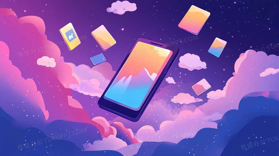 本作品内容为云朵手机应用app科技商务插画, 格式为 jpg, 大小3 MB, 图片尺寸为2912 x 1632, 源文件无水印, 欢迎使用熊猫办公。 如认为平台内容涉嫌侵权,可通过邮件:tousu@tukuppt.com提出书面通知,我们将及时处理。