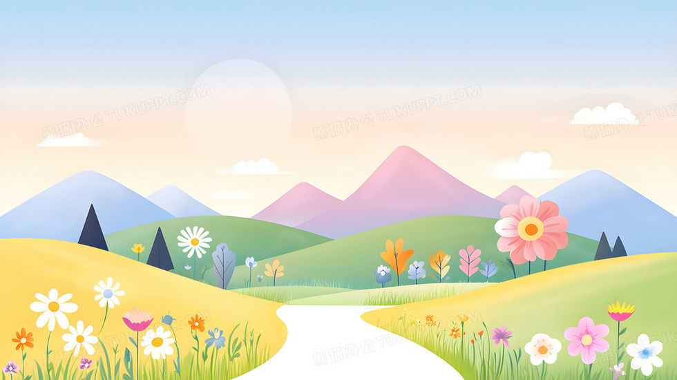 本作品内容为卡通粉彩风格春季花海山峰插画, 格式为 jpg, 大小2 MB, 图片尺寸为2912 x 1632, 源文件无水印, 欢迎使用熊猫办公。 如认为平台内容涉嫌侵权,可通过邮件:tousu@tukuppt.com提出书面通知,我们将及时处理。