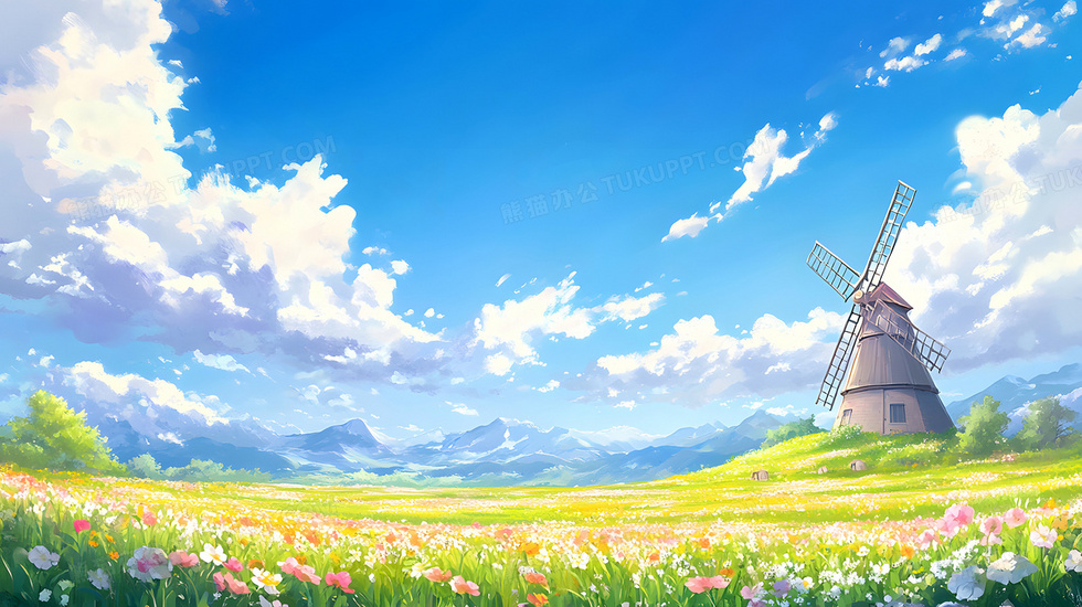 本作品内容为卡通风格春季小菊花草地花海风车蓝天白云插画, 格式为 jpg, 大小3 MB, 图片尺寸为2912 x 1632, 源文件无水印, 欢迎使用熊猫办公。 如认为平台内容涉嫌侵权,可通过邮件:tousu@tukuppt.com提出书面通知,我们将及时处理。