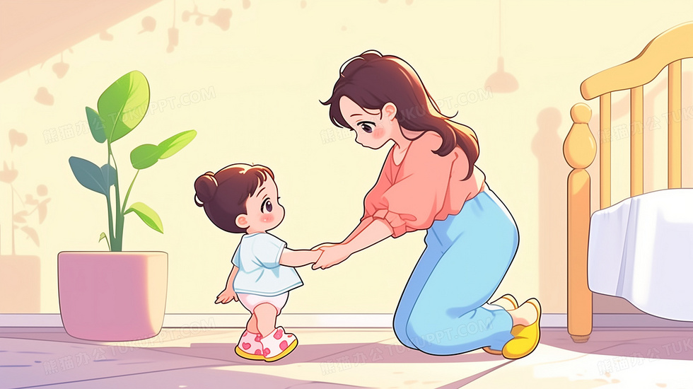 本作品内容为妈妈牵着男婴的手练习蹒跚走路插画, 格式为 jpg, 大小4 MB, 图片尺寸为2912 x 1632, 源文件无水印, 欢迎使用熊猫办公。 如认为平台内容涉嫌侵权,可通过邮件:tousu@tukuppt.com提出书面通知,我们将及时处理。