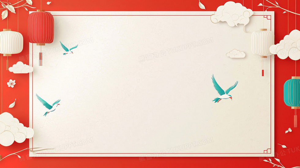 本作品内容为中国风灯笼祥云装饰边框背景, 格式为 jpg, 大小2 MB, 图片尺寸为2912 x 1632, 作品中背景图片无需修改, 源文件无水印,可以直接使用, 欢迎使用熊猫办公。 如认为平台内容涉嫌侵权,可通过邮件:tousu@tukuppt.com提出书面通知,我们将及时处理。