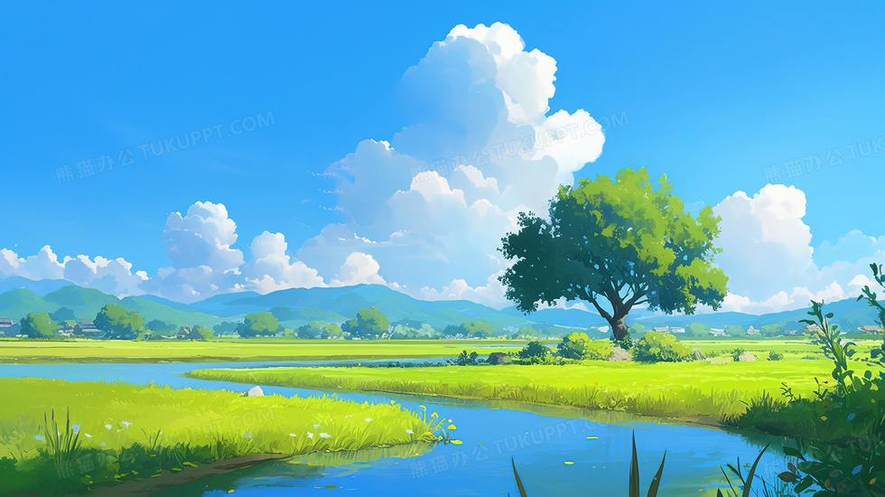 本作品内容为春天草地蓝天白云大自然风景插画, 格式为 jpg, 大小4 MB, 图片尺寸为2912 x 1632, 源文件无水印, 欢迎使用熊猫办公。 如认为平台内容涉嫌侵权,可通过邮件:tousu@tukuppt.com提出书面通知,我们将及时处理。