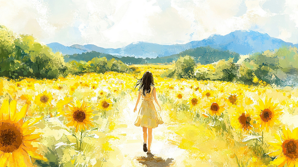 本作品内容为向日葵田野中的漫步女孩水彩风插画, 格式为 jpg, 大小4 MB, 图片尺寸为2912 x 1632, 源文件无水印, 欢迎使用熊猫办公。 如认为平台内容涉嫌侵权,可通过邮件:tousu@tukuppt.com提出书面通知,我们将及时处理。