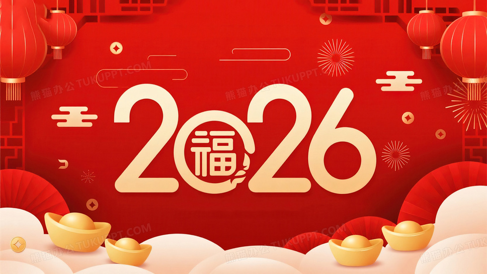 本作品内容为2026年中国新年喜庆插画, 格式为 jpg, 大小6 MB, 图片尺寸为3328 x 1872, 源文件无水印, 欢迎使用熊猫办公。 如认为平台内容涉嫌侵权,可通过邮件:tousu@tukuppt.com提出书面通知,我们将及时处理。