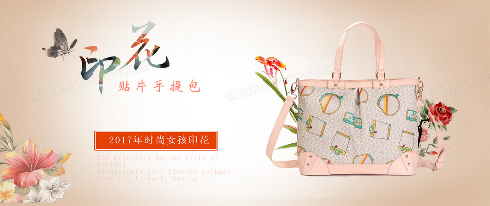 本作品内容为印花手提女包淘宝天猫海报背景banner, 格式为 psd, 图片尺寸为1920 x 808, 作品中背景图片无需修改, 源文件无水印,可以直接使用, 欢迎使用熊猫办公。 如认为平台内容涉嫌侵权,可通过邮件:tousu@tukuppt.com提出书面通知,我们将及时处理。