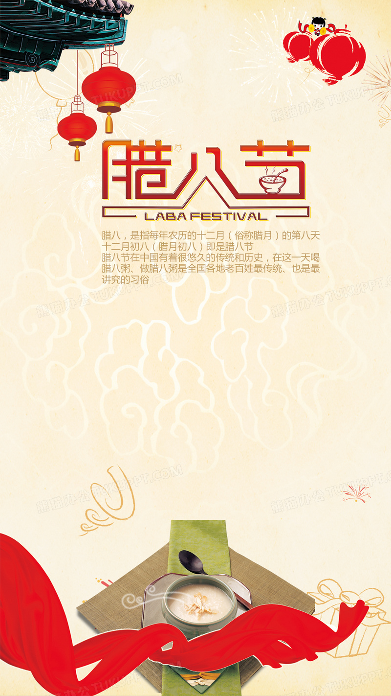 本作品内容为腊八节喜庆节日背景, 格式为 psd, 图片尺寸为1080 x 1920, 作品中背景图片无需修改, 源文件无水印,可以直接使用, 欢迎使用熊猫办公。 如认为平台内容涉嫌侵权,可通过邮件:tousu@tukuppt.com提出书面通知,我们将及时处理。