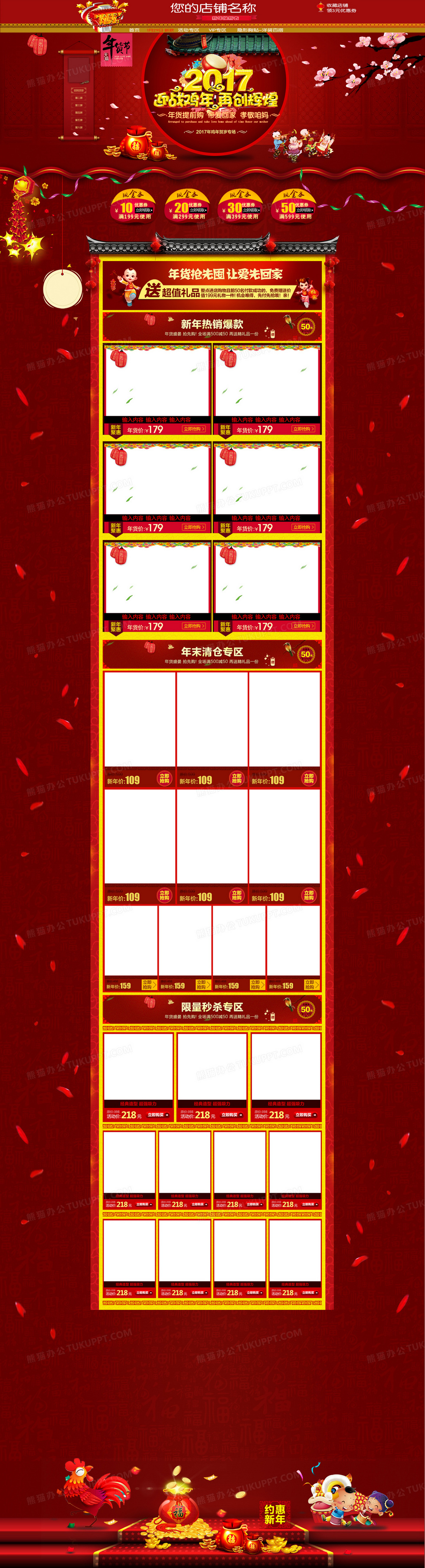 本作品内容为2017年红色狂欢年货节店铺首页背景, 格式为 psd, 图片尺寸为1920 x 7082, 作品中背景图片无需修改, 源文件无水印,可以直接使用, 欢迎使用熊猫办公。 如认为平台内容涉嫌侵权,可通过邮件:tousu@tukuppt.com提出书面通知,我们将及时处理。